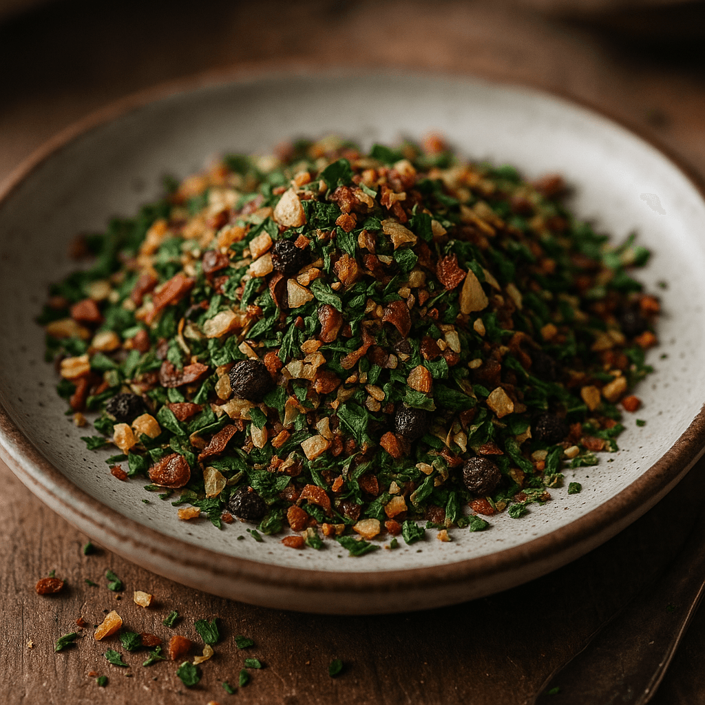 Composition : Oignons fumé concassé*, Oignon concassé*, Ail concassé*, Persil*, Poivrons rouge concassé*, Basilic*, Ciboulette*, Poivre noir du Sri-Lank moulu*.