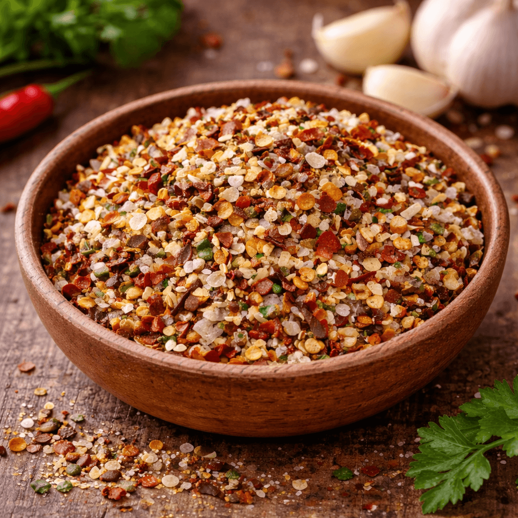 Sel, Ail*, Piment*, Paprika *, Oignon*, Jalapeno vert*, Persil*