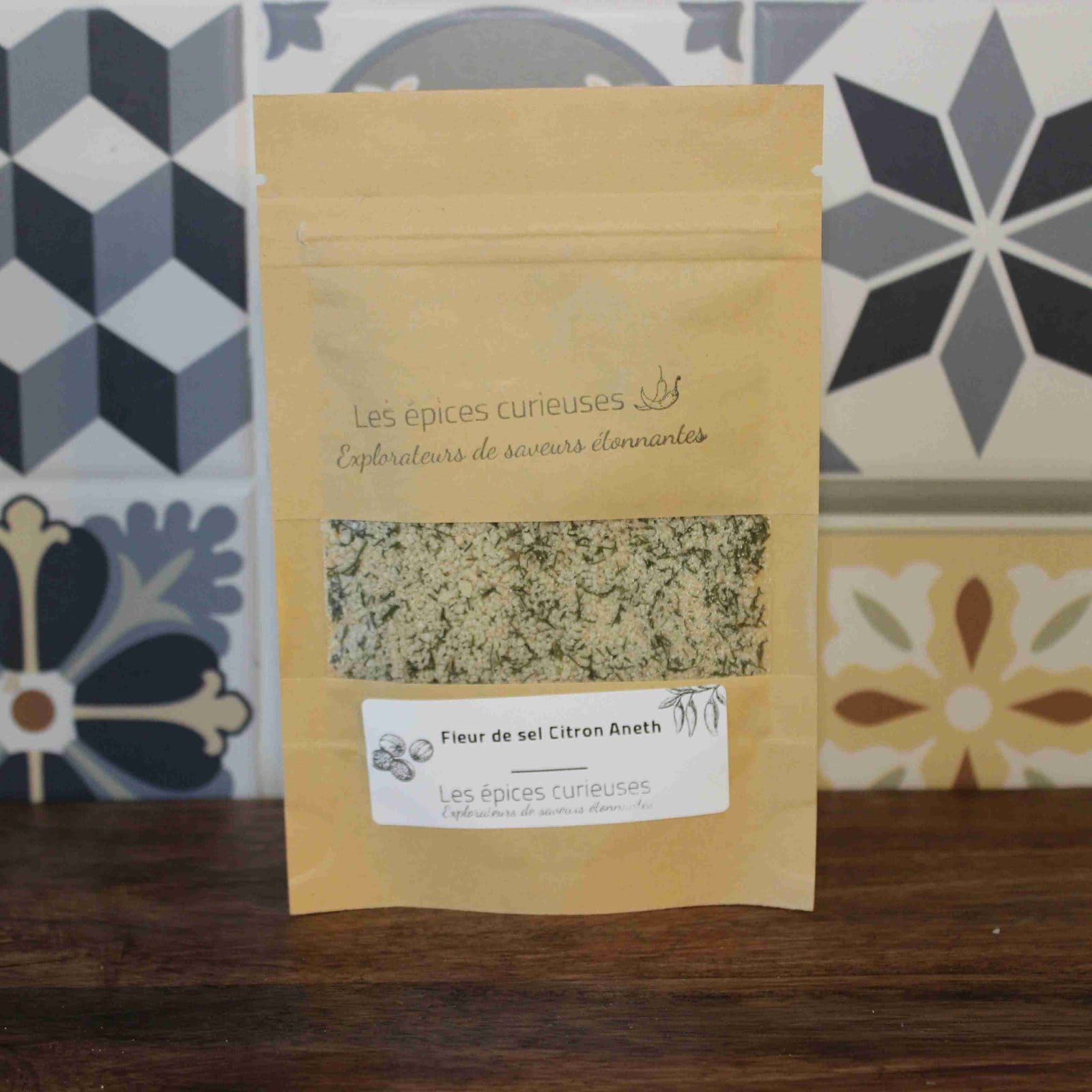 Découvrez la Fleur de sel – Citron Aneth des Épices Curieuses. Un mélange raffiné qui sublimera vos plats avec son goût frais et citronné. Parfait pour rehausser poissons et fruits de mer. Une touche de gourmet dans votre cuisine !