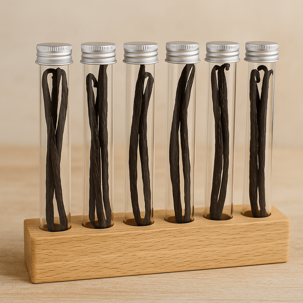 Découvrez le Kit d’implantation Vanille – Socle Bois & Tubes Raffinés de la marque Les Épices Curieuses. Ce kit se compose d’un élégant support en bois de hêtre, conçu pour accueillir six tubes raffinés de vanille de Madagascar. Chaque tube contient des gousses de vanille soigneusement sélectionnées pour leur saveur douce et sucrée, leur texture moelleuse et leur couleur brun foncé qui témoigne de leur maturité parfaite. Ce produit est une célébration des traditions malgaches, où la vanille est cultivée avec amour et soin depuis des générations.