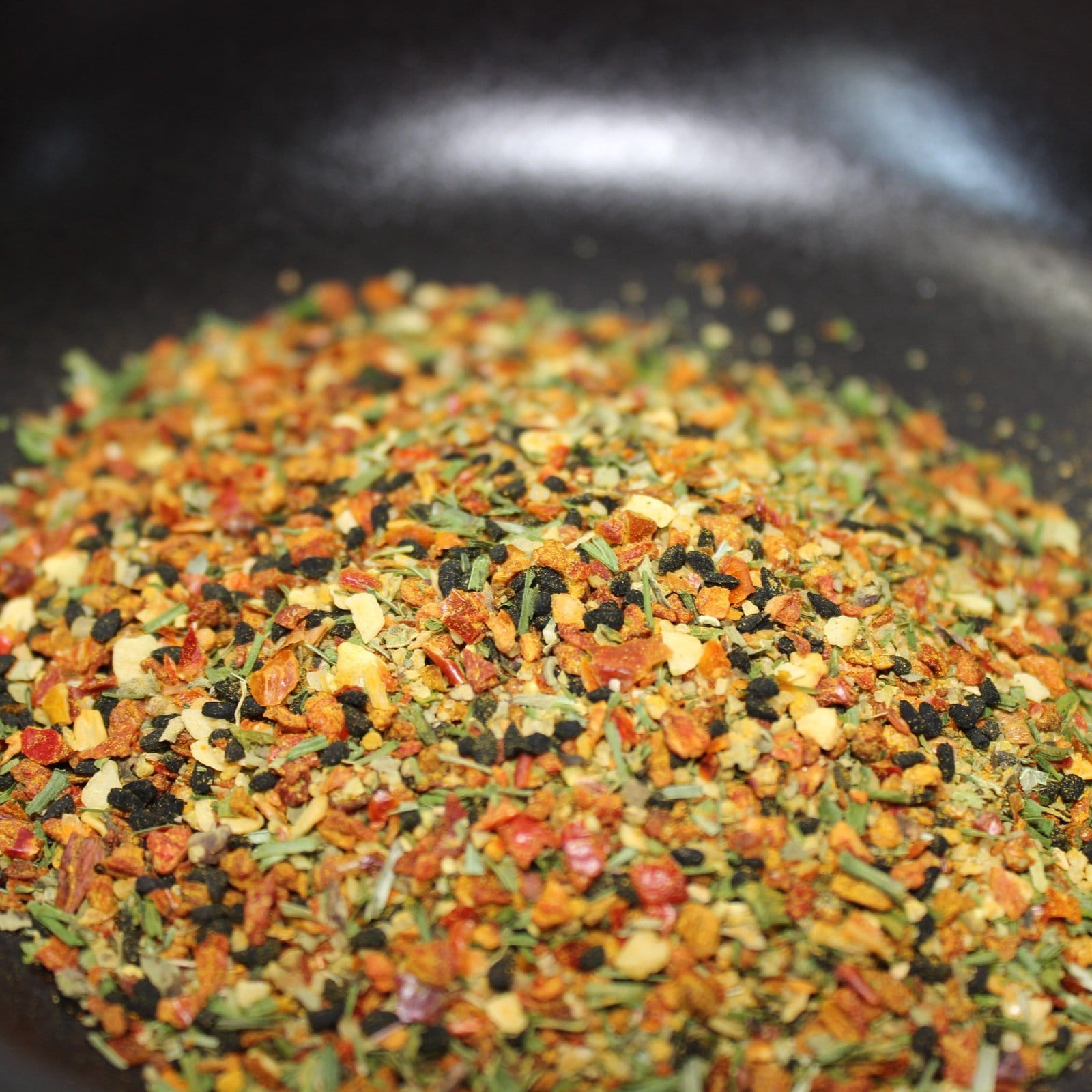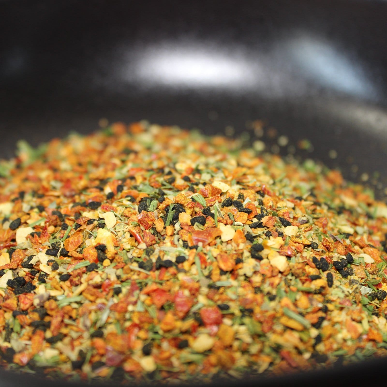 Composition : Fleur de Sel 30%, tomates*, poivrons*, cumin noir*, ail*, ciboulette*, Piment*, poivre*, curcuma*, basilic*, zeste de citron*, Noix de muscade*.