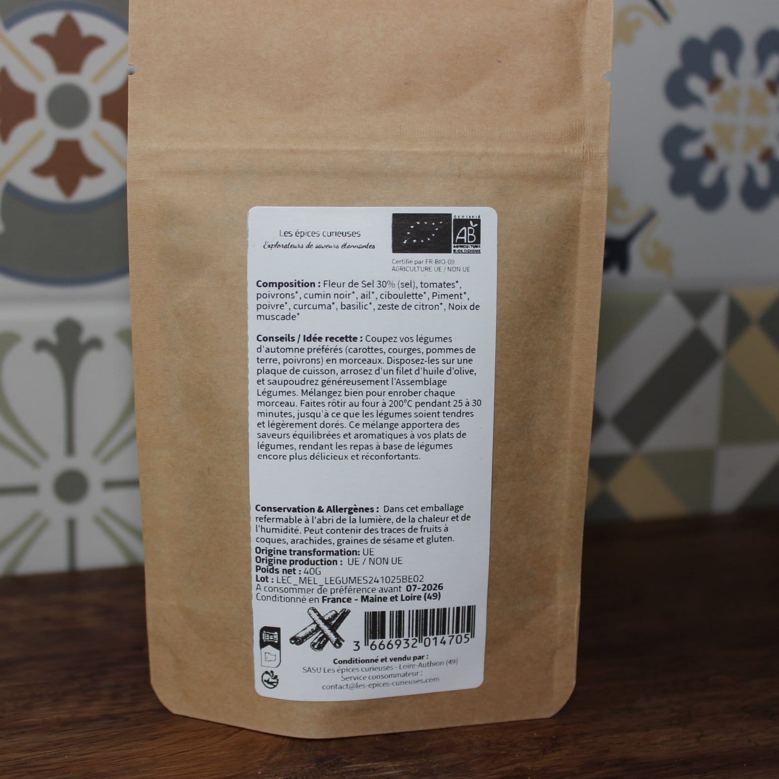 Découvrez notre Assemblage à Légumes Les Épices Curieuses. Un mélange subtil de fleur de sel et herbes aromatiques pour rehausser vos plats. Succombez au mélange de saveurs avec tomates, poivrons et cumin noir!