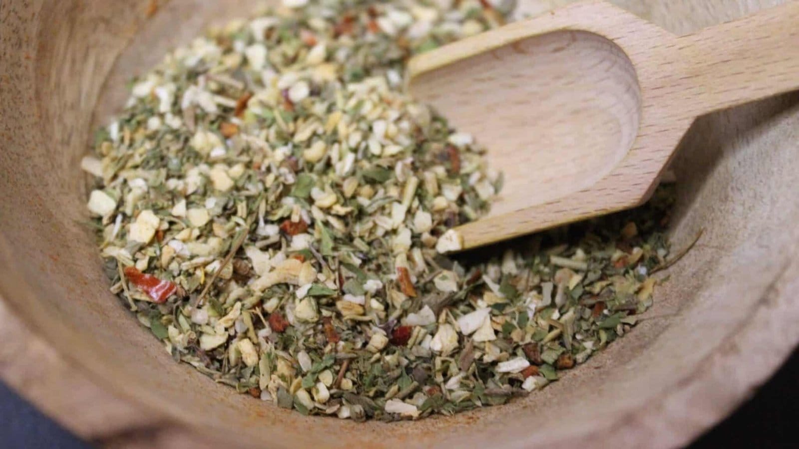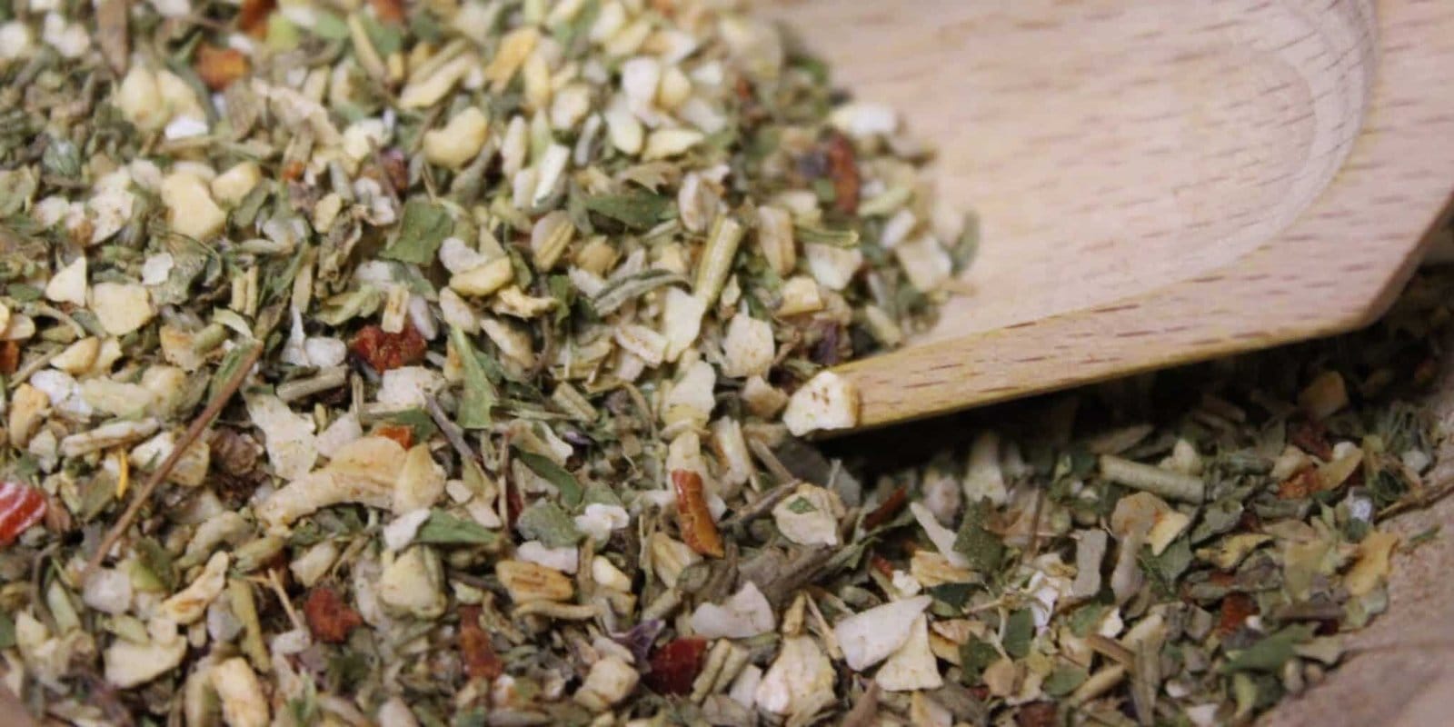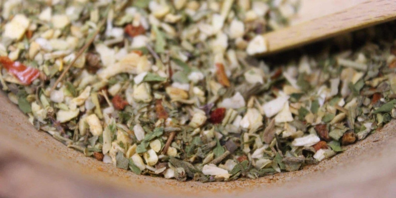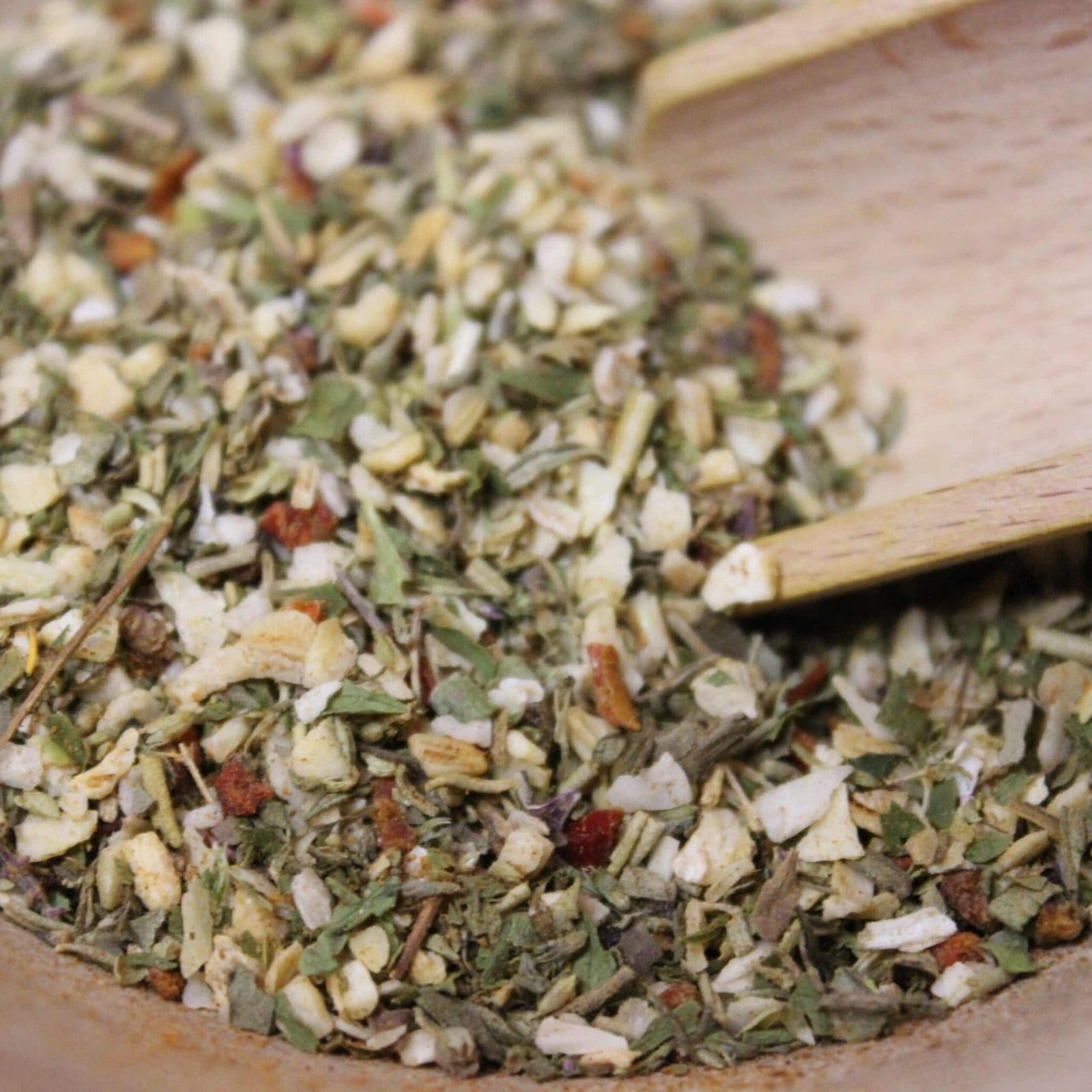 Composition : Oignon*, ail*, piment*, fleur de sel (sel), poivre*, romarin*, poivrons*, thym*, basilic*, origan*, persil*.