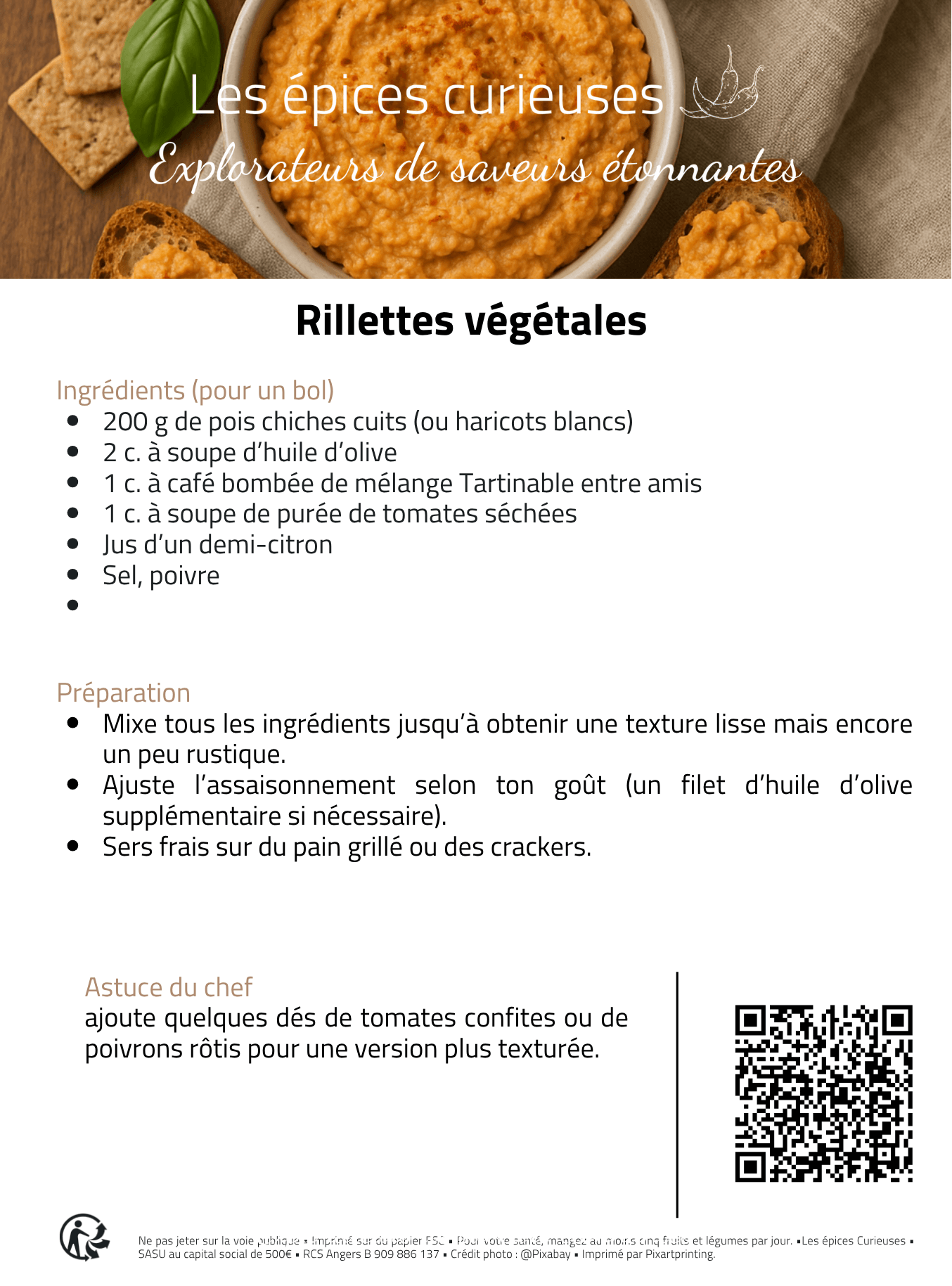 Découvrez le plaisir de cuisiner avec les Recettes du mois – Flyers A5 des Épices Curieuses. Chaque flyer vous propose une recette savoureuse et originale, qui met en valeur l’univers gustatif unique de nos épices. En feuilletant les pages, vous serez séduit par la richesse des saveurs, les textures variées et les couleurs vibrantes de chaque plat.